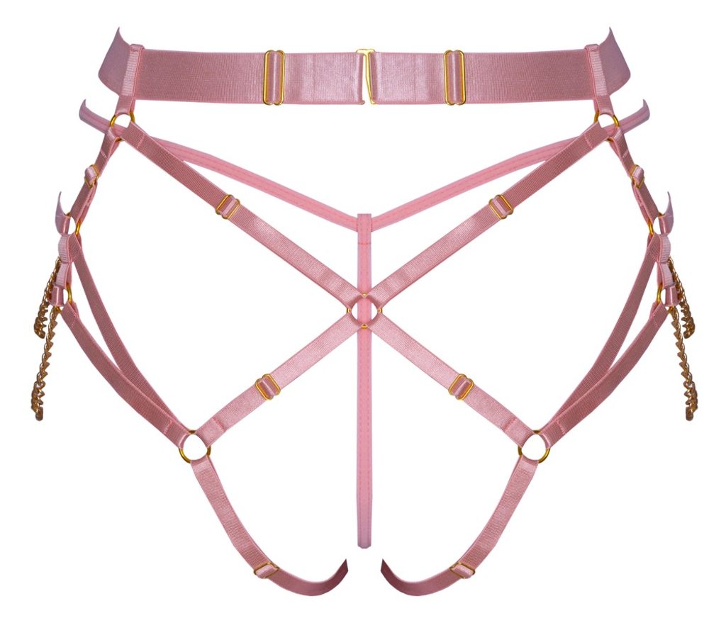 Výrazný kúsok spodnej bielizne, ktorý zaujme jemnou ružovou farbou a luxusnými zlatými detailmi. Elastické pásiky sa elegantne lesknú na tele a vďaka nastaviteľným popruhom i širšiemu pásu si ľahko prispôsobíš strih podľa seba. Predné a bočné retiazky dodávajú modelu šperkový efekt a zvýrazňujú každý pohyb.