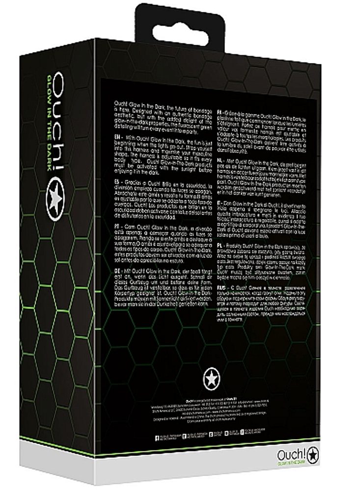 Glow in the Dark, budúcnosť otroctva od Ouch! je tu. Navrhnuté s autentickou estetikou bondage, ale s pridaným potešením z vlastností svietiacich v tme, fluorescenčné zelené detaily premenia každú udalosť v žiare v tme, zábava tak ešte len začína, keď zhasnú svetlá.