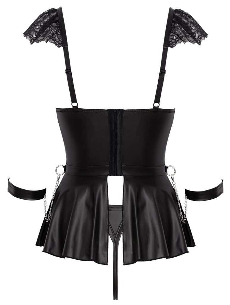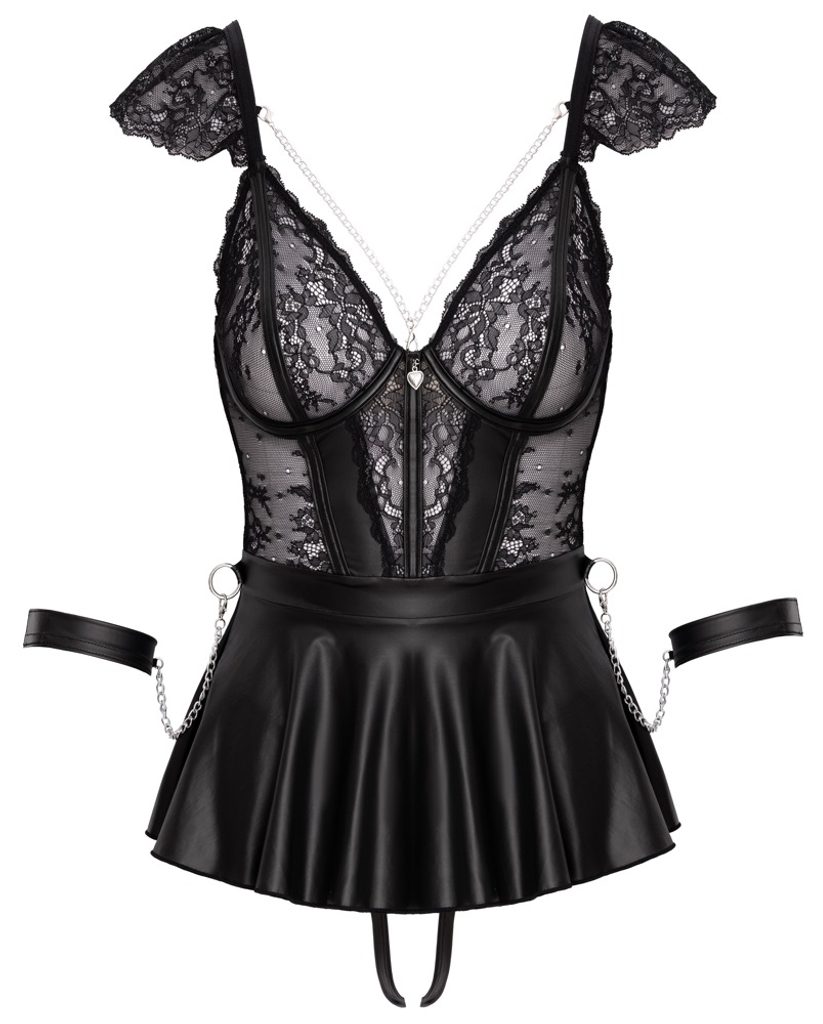 Tento 3-dielny model od Cottelli BONDAGE zahŕňa babydoll, otvorené tangá a mäkké putá. Elegantná kombinácia čipky a matného materiálu vytvára atraktívny kontrast, ktorý dopĺňajú strieborné doplnky.