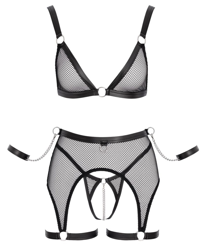 Zmyselný a hravý set v bondage štýle, ktorý zaujme kombináciou sieťovaného materiálu a výrazných detailov.
