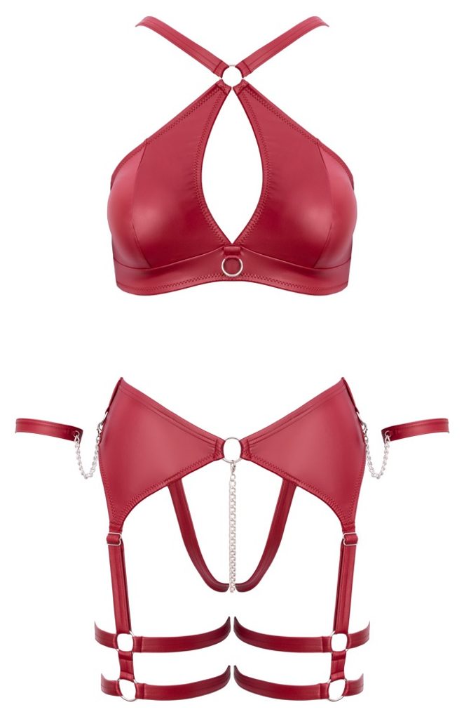 Zmyselný a výrazný set v bondage štýle, ktorý zaujme kombináciou detailov a tmavo červeného matného materiálu.