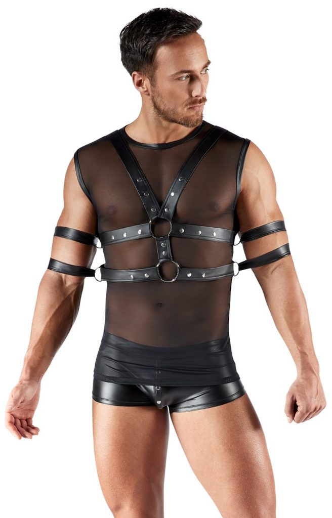 Košeľa bez rukávov, harness a 4 putá na zápästia/ruky v čiernej sade od Svenjoyment BONDAGE. Priliehavá košeľa je vpredu vyrobená z jemného powernetu a vzadu má matný vzhľad. Niektoré časti košele majú lemovanie s matným vzhľadom. Košeľa je mäkká a elastická, čo zaručuje veľmi pohodlné nosenie. Harness má nastaviteľné popruhy s matným vzhľadom (patentky). Na hrudníkových a brušných popruhoch sa nachádzajú aj krúžky, ku ktorým je možné pripevniť priložené putá. Mäkké putá sa dajú rýchlo nasadiť a jednoducho nastaviť vďaka zapínaniu na háčiky a slučky.