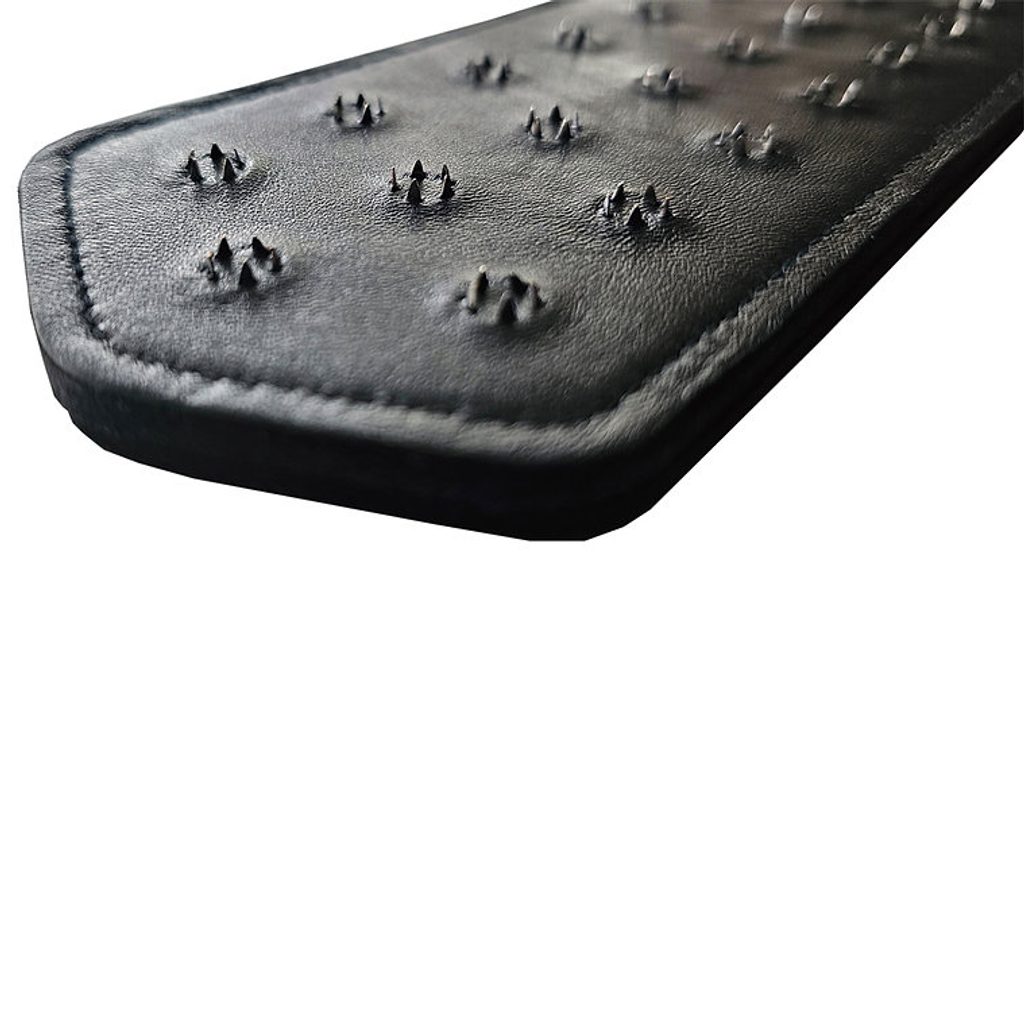 Ručne vyrobený z dvoch vrstiev pravej kože, dlhý 33 cm, široký 7,5 cm a so 22 zhlukmi hrotov.