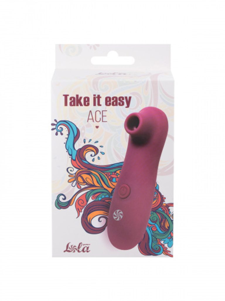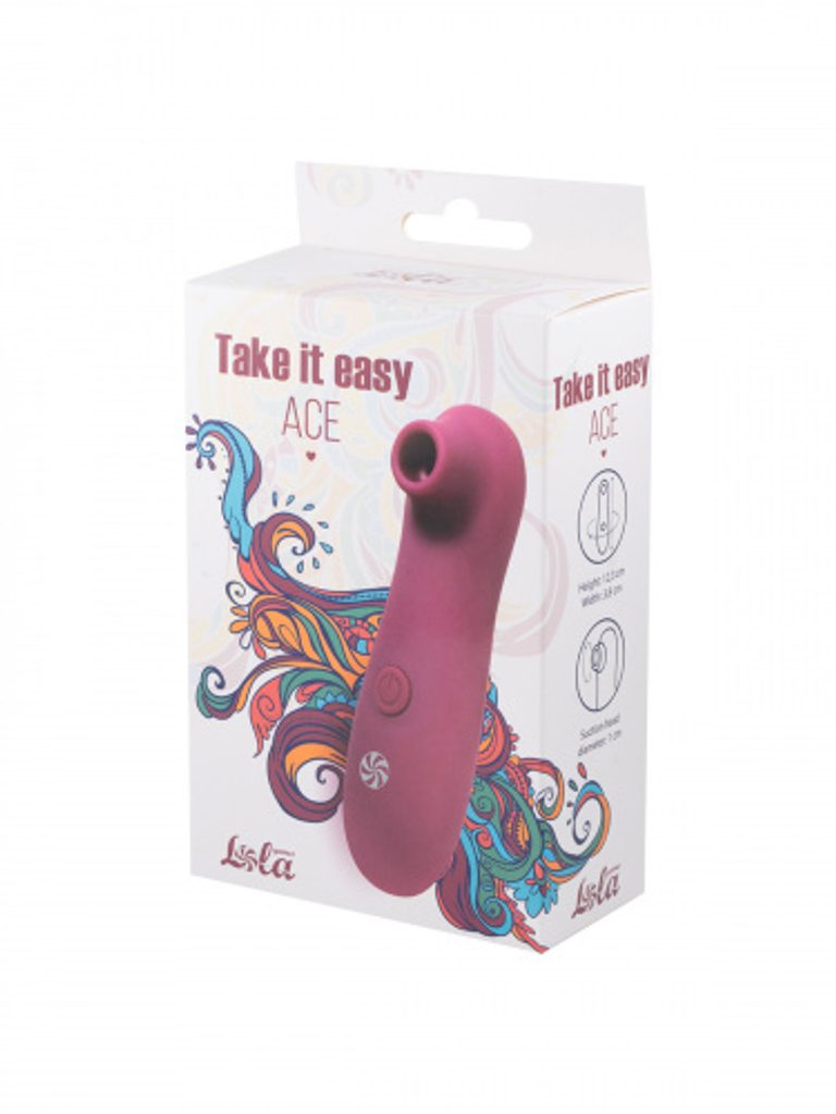Vákuový stimulátor klitorisu Ace z kolekcie Take It Easy je vyrobený z ABS šetrného k pokožke. Hračka má mäkký a zamatovo mäkký povrch a neobsahuje ftaláty. Hračka je napájaná 2 batériami AAA (nie sú súčasťou balenia). 10 stimulačných režimov pre celé spektrum potešenia. Odolný proti striekajúcej vode. Tento stimulátor je vhodný ako pre sólovú stimuláciu, tak aj pre párové hry. Výška: 12,3 cm; Šírka: 3,8 cm; Priemer hubice: 1 cm.