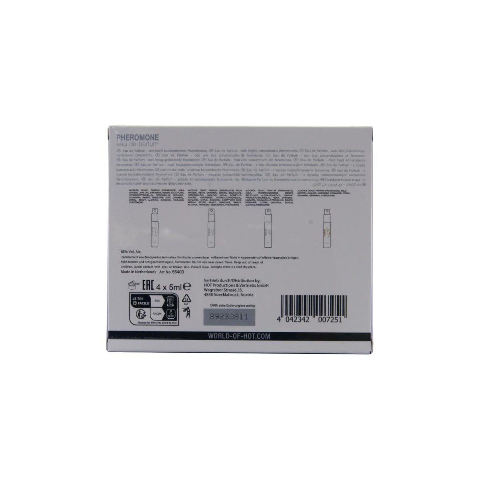 Feromóny, ktoré sú prirodzenými sexuálnymi atraktantmi, majú schopnosť lákať opačné pohlavie. Táto nová kolekcia využíva starostlivo testovanú zmes feromónov androstenolu a androstenónu, čo robí z týchto parfémov jedinečnú voľbu. Majú silný erotický účinok a magicky priťahujú mužov. Jedná sa o sofistikované parfémy, ktoré sú nielen krásne voňajúce, ale tiež zvýrazňujú sexuálnu príťažlivosť žien.