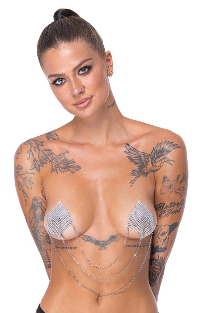 Strieborné nálepky na bradavky Nipple Stickers Square od značky Cottelli ACCESSOIRES majú trblietavý diamantový tvar a tri jemné, pohyblivé spojovacie retiazky. Nálepky sa ľahko aplikujú a pri opätovnom priložení ochrannej fólie ich možno používať opakovane.