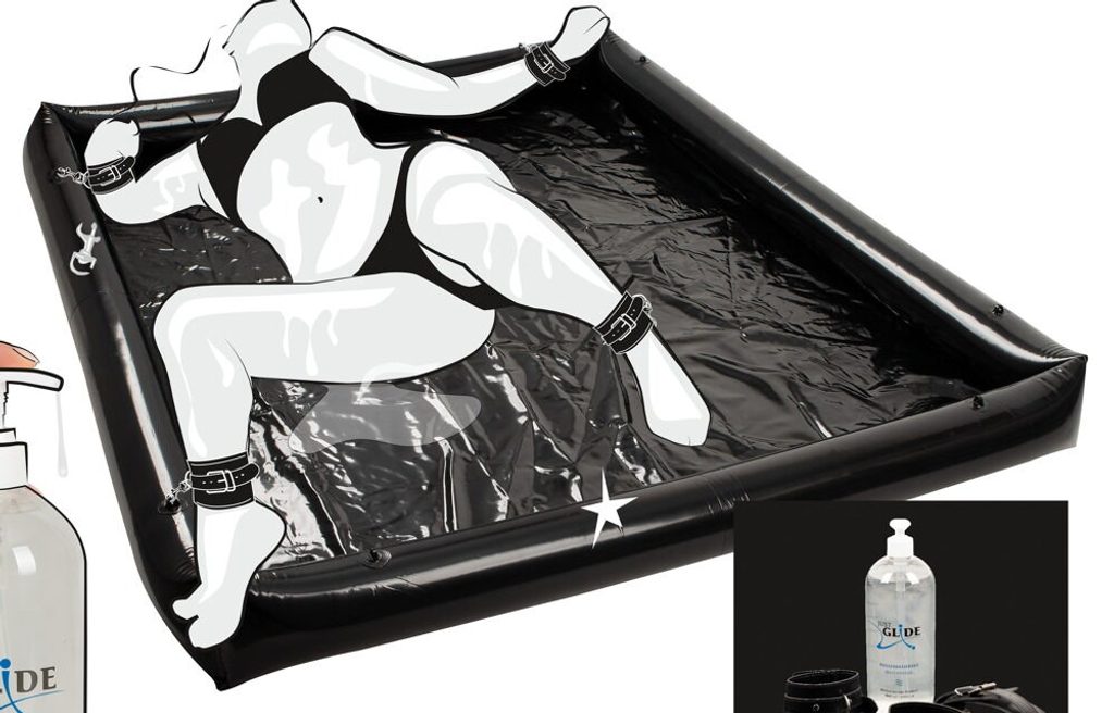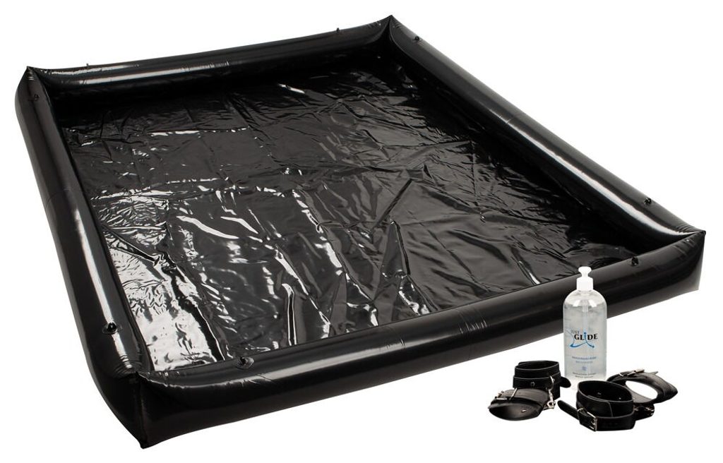 Dodáva sa s putami a manžetami na členky a tiež s 1 litrom lubrikantu!Čierna vinylová doska Glossy Games od Fetish Collection, ktorá obsahuje 4 obmedzovače a 1 liter lubrikantu. Prestieradlo s nafukovacím okrajom (výška 15 cm) zaručuje dokonalú ochranu na akomkoľvek povrchu (napr. posteľ, gauč, koberec atď.) a ponúka množstvo priestoru (140 x 185 cm) pre extra mokré, mastné, penové, úžasne klzké hry. Má 8 navarených očiek (2 v každom rohu) na pripevnenie priložených pút a členkových pút pomocou karabínok – je to rýchle a jednoduché. Prestieradlo je možné tiež ľahko utrieť, čo znamená, že je behom okamihu vyčistené a pripravené na ďalšie použitie.