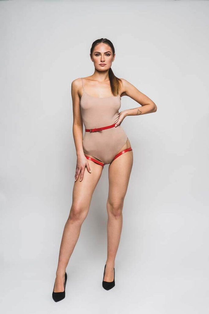 Sexi postroj na zadok v červenej farbe je absolútnym stelesnením erotických snov tých, ktorí chcú vyskúšať niečo nové. Čierny opasok krásne lemuje ženské krivky a vy si môžete vychutnávať zaslúžený pohľad.