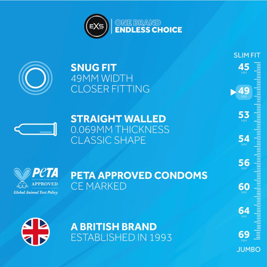 Popis výrobku EXS kondómy Snug Fit - Špeciálne menšie kondómy pre menšie rozmery Materiál výrobku Materiál: Latex - kondómy Tento materiál je veľmi elastický a našiel uplatnenie v mnohých odboroch. Prírodný latex obsahuje viac ako 150 bielkovín az toho 35 z nich môžu pôsobiť ako alergény.