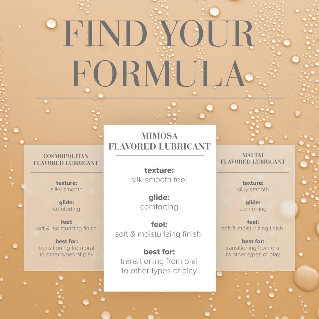 Zábava pre dospelých sa spája s lahodnými príchuťami v populárnych ochutených lubrikantoch na vodnej báze inšpirovaných koktaily. Tieto lubrikanty ponúkajú zmyselný a upokojujúci kĺzavý pocit s hodvábne hladkou textúrou, čo je ideálne pre akýkoľvek intímny moment, najmä pri prechode z orálneho potešenia na iné aktivity. Po použití sa ľahko zmývajú a zanechávajú pokožku jemnú a hydratovanú. Dostupné príchute zahŕňajú Pina Colada, Sex on the Beach a Mojito, rovnako ako nové varianty Mimosa, Cosmopolitan a Mai Tai.