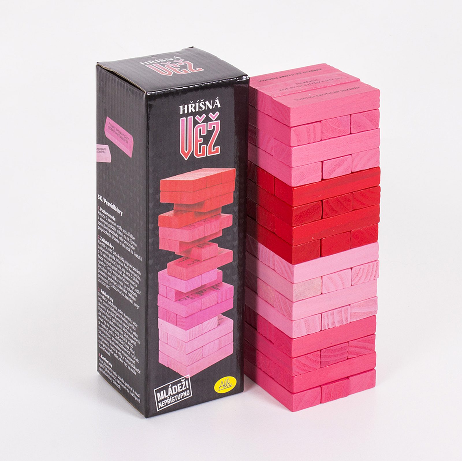 Odoberte drevený kameň z hriešneho poschodí Jenga, prečítajte si úlohu a položte kameň hore na Jenga. Ak úlohy nesplníte, alebo nechcete splniť odložte si jednu časť oblečenia. Potom je na rade druhý hráč. Komu Jenga spadne hra končí a prehratý bude musieť vykonať špeciálnu úlohu, na ktorom sa pred začiatkom hry dohodnete. Je povolené s kameňmi manipulovať len jednou rukou a vždy je nutné dokončiť celé poschodie Jenga než sa môže stavať nové. Hru môžete hrať aj v skupine viac ľudí a na plnenie úlohy s partnerom si vybrať kohokoľvek z nich. Balenie obsahuje: 48 drevených kameňov s erotickými úlohami a pravidlá hry v slovenskom jazyku