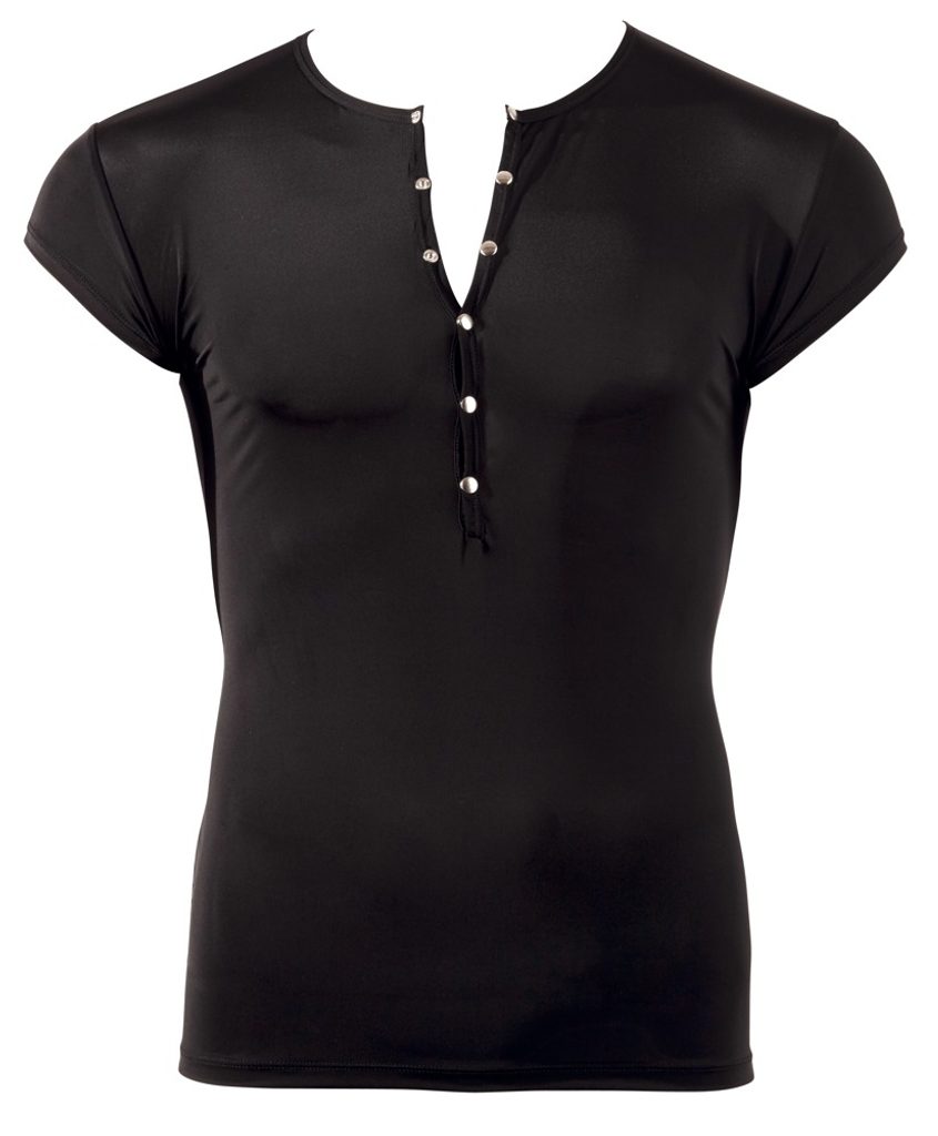 Košeľa má krátke rukávy a zapínanie na kovové patenty v kontrastnej striebornej farbe, čo dodáva celkovému vzhľadu štýlový a jemne provokatívny nádych. Ideálna voľba pre sebavedomých mužov, ktorí sa neboja byť v centre pozornosti.