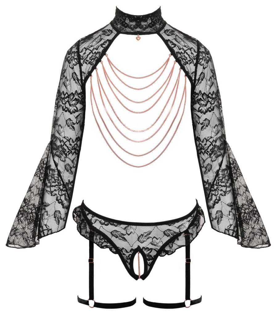Tento crotchless komplet tvorí bolerko s otvorenými košíčkami a podväzkové nohavičky, ktoré zvýrazňujú siluetu a pritiahnu pozornosť na každý detail. Kombinácia kvetinovej čipky a zamatových prvkov pôsobí elegantne a zároveň hravo.