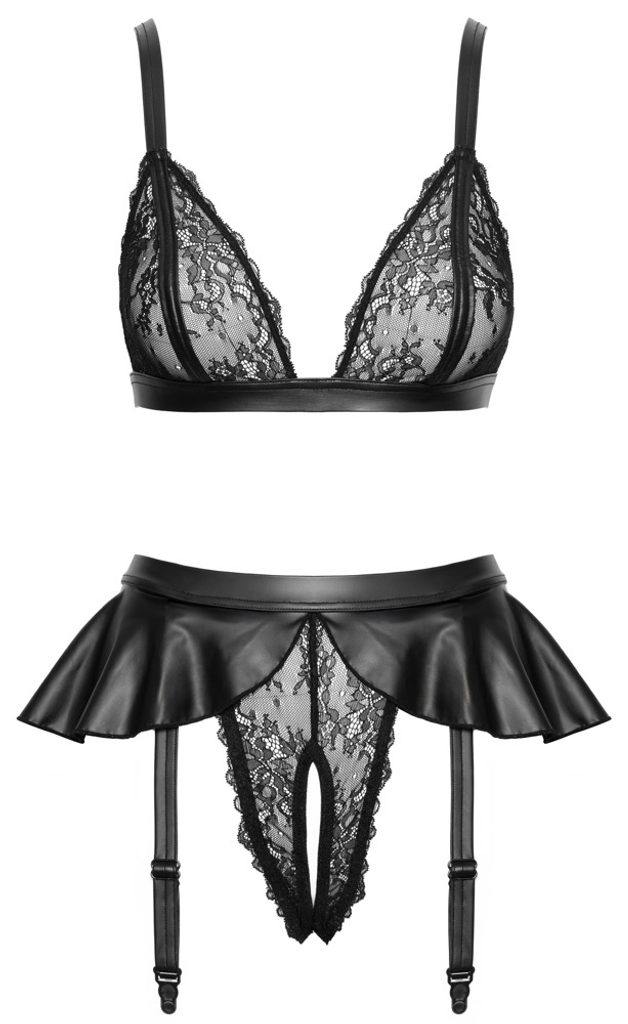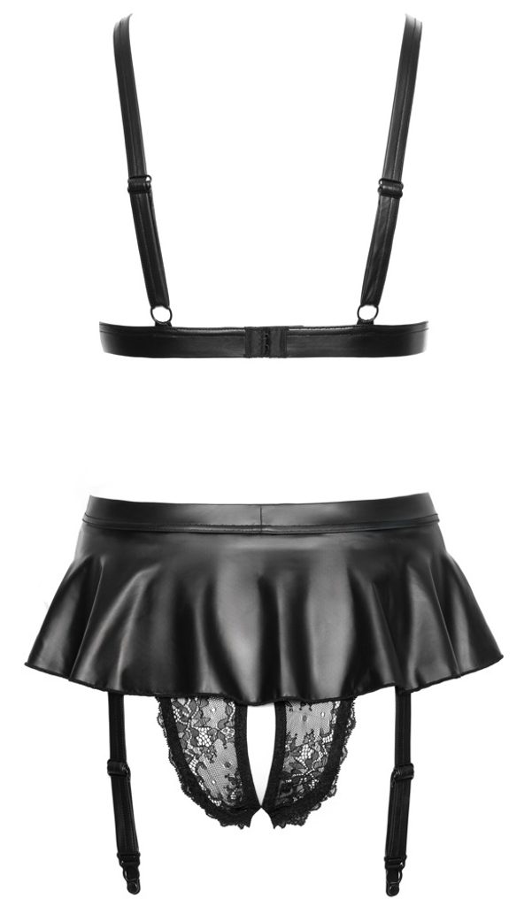 Podprsenka s čipkovanými, nevystuženými košíčkami ponúka prirodzené zvýraznenie, zatiaľ čo nastaviteľné ramienka a zadné zapínanie umožňujú perfektné usadenie. Nohavičky majú otvorený rozkrok a sú doplnené efektnou „sukničkou“ z materiálu vo vzhľade wetlook, ktorá dodáva modelu hravý a zvodný charakter. Podväzkové pásiky je možné jednoducho upraviť alebo úplne odopnúť.
