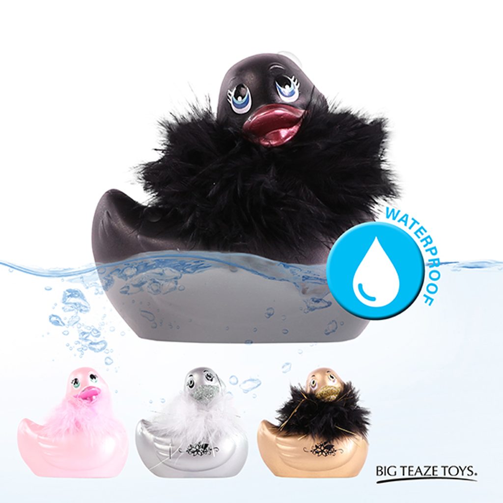 Čierna vibračná kačička slúži ako masážny a stimulujúci erotická pomôcka do vane. Krásna kačička má okolo krku perové boa, ktoré možno odopnúť. Zobáčik je zdobený trblietavým piercingom. Vibrácie sa spúšťajú stlačením kačičky. Batérie sú súčasťou balenia (2 x AA). Veľkosť 12 cm.