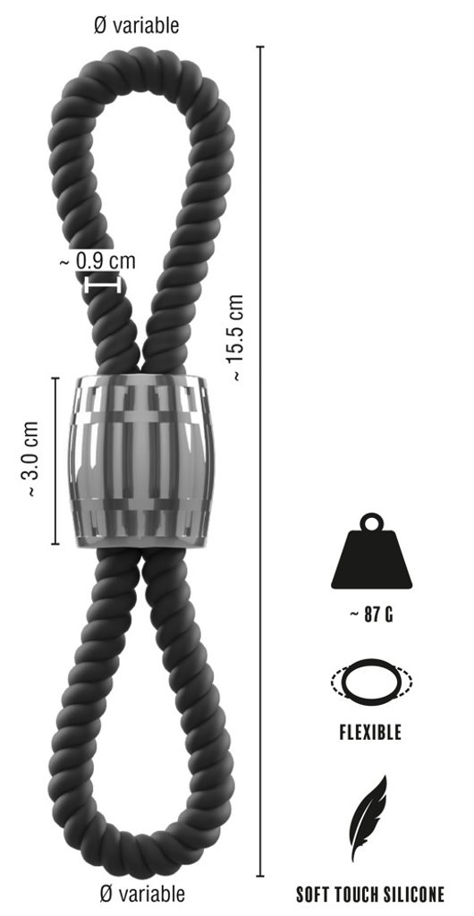 Čierna slučka Heavy Rope Cock Strap od značky Rebel prináša nový rozmer potešenia! Táto dvojitá slučka z pružného a hodvábne mäkkého silikónu má štýlový lanový dizajn doplnený posuvným kovovým závažím (87 g).