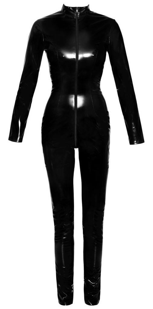 Odvážny vinylový overal, ktorý vytvára výrazný, hladký look od hlavy až po päty.