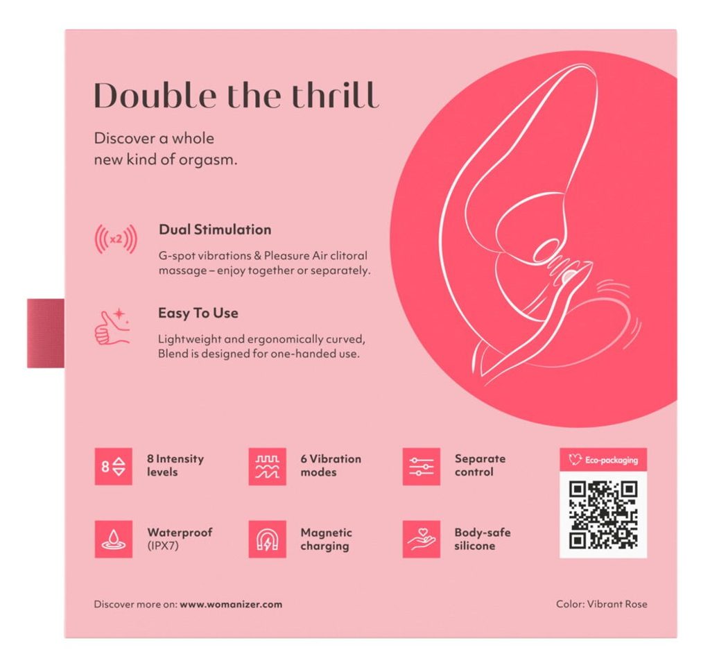 Dva motory poskytujú tichý a spoľahlivý výkon pre dvojitú stimuláciu. Každý je možné ovládať samostatne (stlačením tlačidla) pre individuálne potešenie. Pulzátor stimuluje klitoris s 8 úrovňami intenzity. Pre stimuláciu bodu G sú k dispozícii 3 vibračné režimy v 3 intenzitách. Womanizer Blend je možné použiť aj vo vani, pretože je vodeodolný. Je dobíjací a súčasťou balenia je USB kábel.